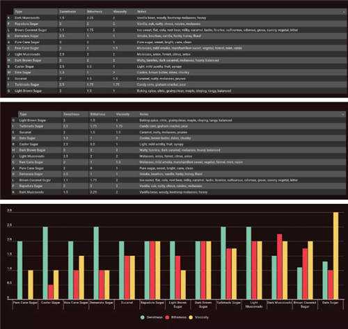 我们还了解到,有些糖比其他糖更容易变质。我们没有测试 Rapadura Sugar和浅黑砂糖 Light Muscovado sugars,因为还没到测试这两种糖浆就变质了(在室温下放置了一个多星期)。尽管在最初的品尝中加入了两种替代糖,即棕椰子糖 Brown Coconut Sugar和枣糖Date Sugar,但它们在和咖啡混合中表现的不太好,这些糖可能是烘焙食品中比较好的选择,但它们本身的味道并不好(甚至没有甜味)。