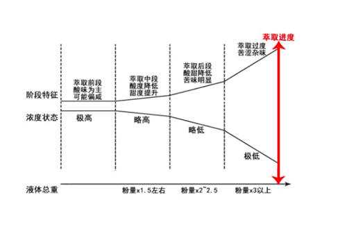 首先,这张图上面的曲线是萃取的状态,把一杯完整的浓缩咖啡分成前、中、后段,每段萃取出的物质有所不同。后段再继续萃取下去,就是过度萃取了。
