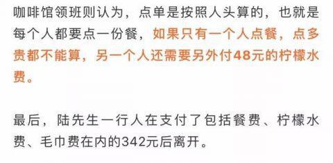 昨天上午,陆先生联系记者:在钱江世纪城的蓝山咖啡馆消费时,我们5个人点了4份餐,最后结账的时候,餐厅要求再额外支付一份48元的柠檬水钱,我们觉得不合理。双方就账单问题发生了分歧。